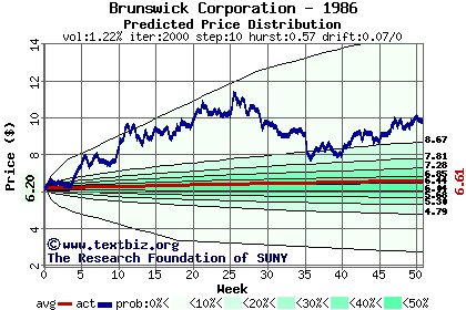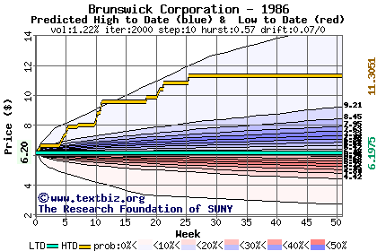 The high to date and low to date prices of the stock plotted against a random walk model for 1986 (what's this?).
