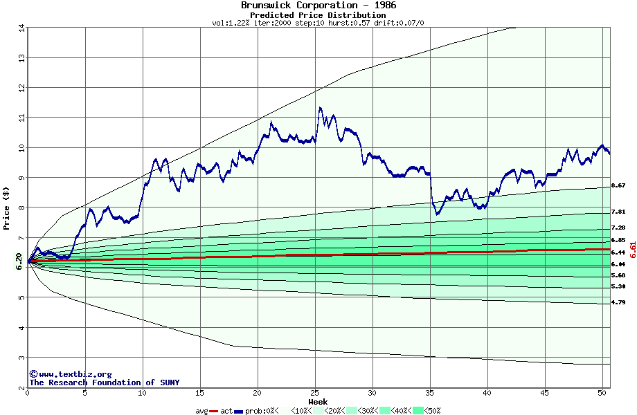 The following graph plots the year-to-date performance of the stock for 1986 compared to the probability calculated by a random walk model.