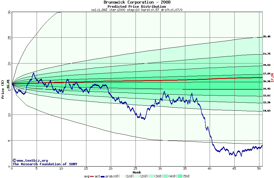 The high to date and low to date prices of the stock plotted against a random walk model for 2008 (what's this?).