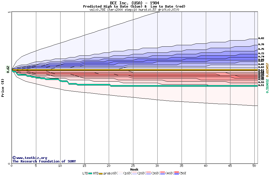 The high to date and low to date prices of the stock plotted against a random walk model for 1984 (what's this?).