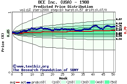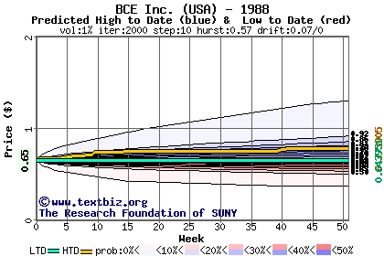 The high to date and low to date prices of the stock plotted against a random walk model for 1988 (what's this?).