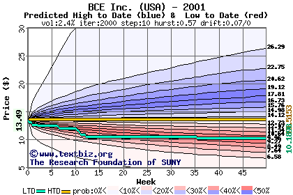 The high to date and low to date prices of the stock plotted against a random walk model for 2001 (what's this?).