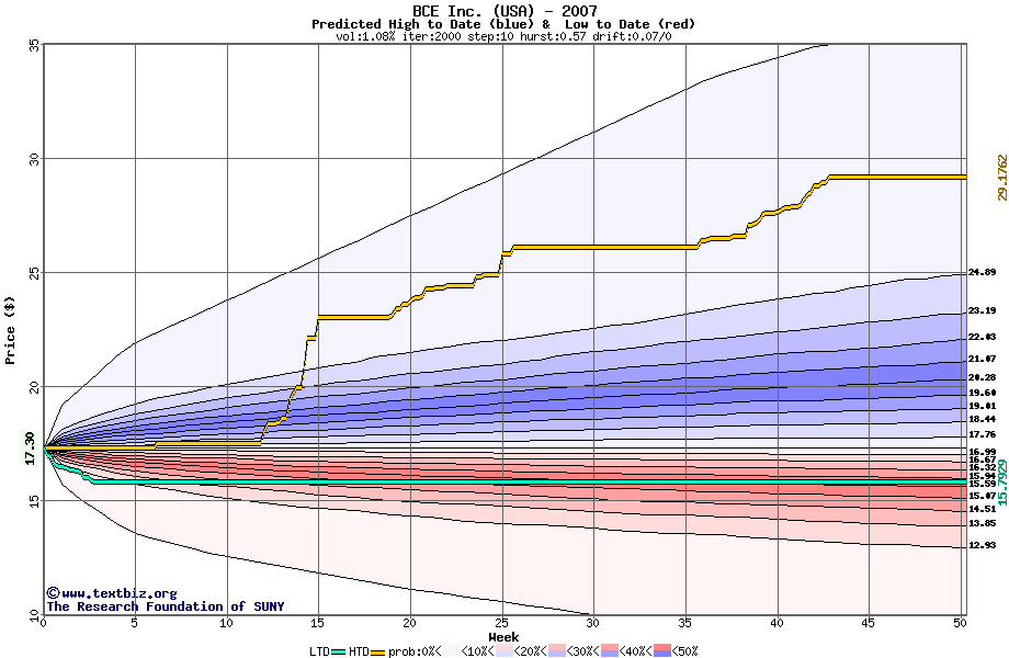 The high to date and low to date prices of the stock plotted against a random walk model for 2007 (what's this?).