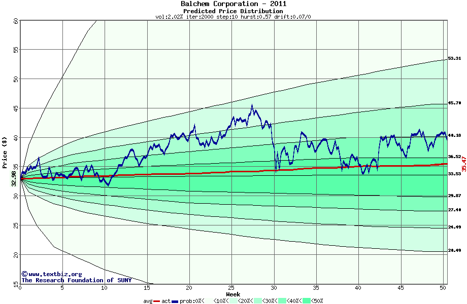 The following graph plots the year-to-date performance of the stock for 2011 compared to the probability calculated by a random walk model.
