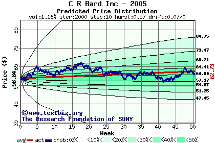 The following graph plots the year-to-date performance of the stock for 2005 compared to the probability calculated by a random walk model.