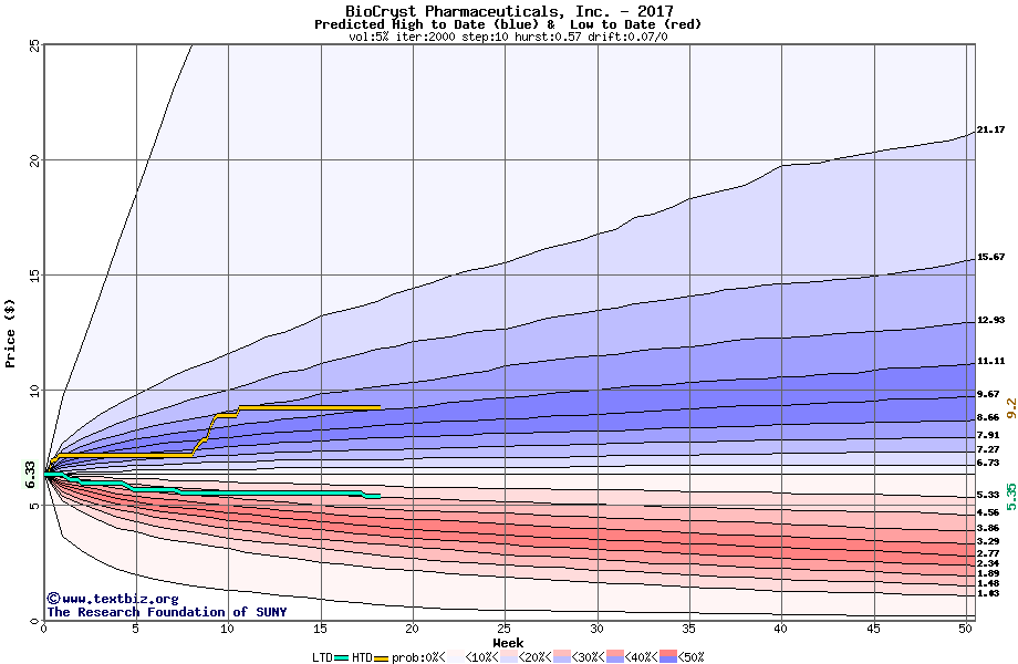 The high to date and low to date prices of the stock plotted against a random walk model for 2017 (what's this?).