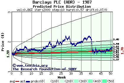 The high to date and low to date prices of the stock plotted against a random walk model for 1987 (what's this?).