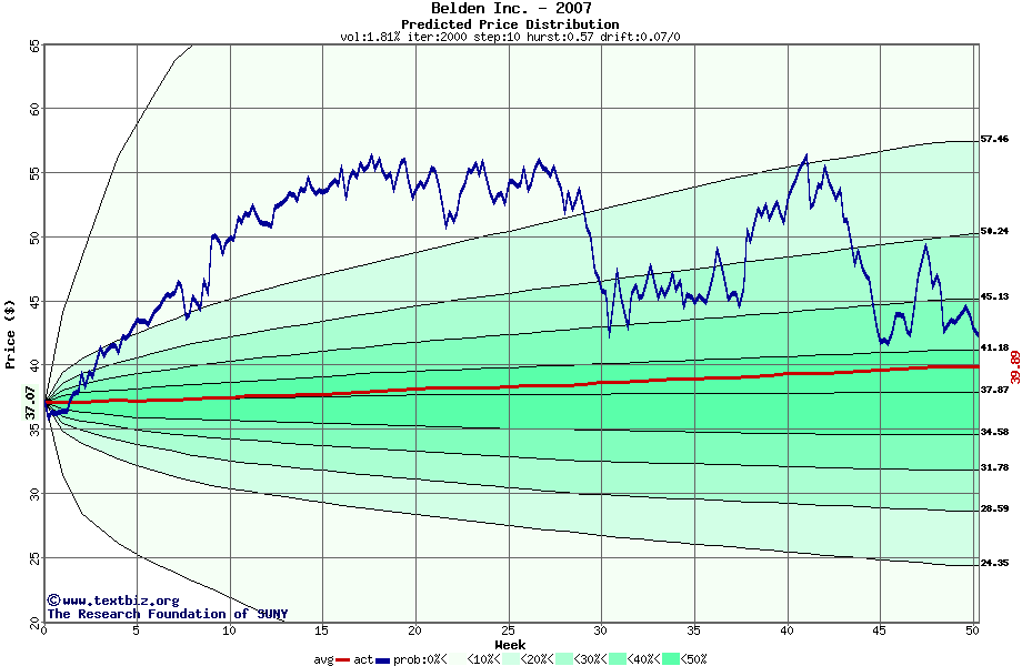 The following graph plots the year-to-date performance of the stock for 2007 compared to the probability calculated by a random walk model.