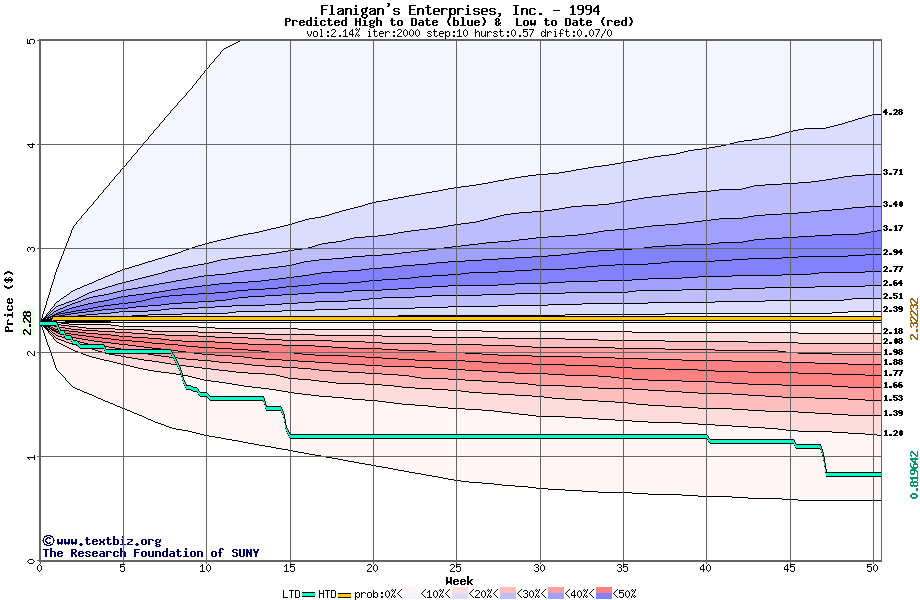 The high to date and low to date prices of the stock plotted against a random walk model for 1994 (what's this?).