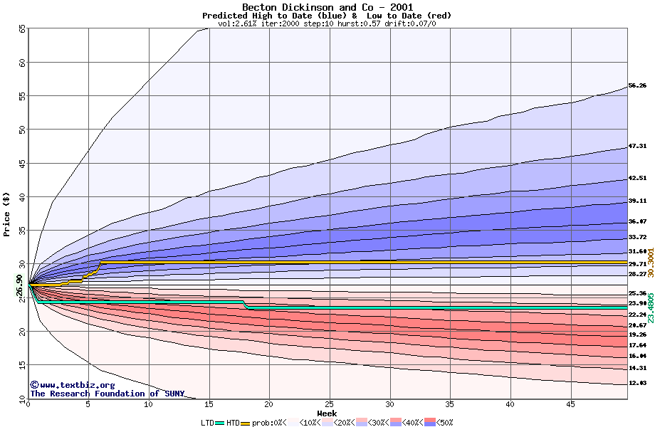 The high to date and low to date prices of the stock plotted against a random walk model for 2001 (what's this?).