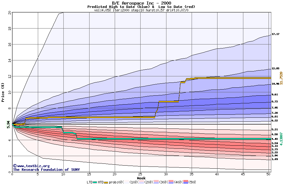 The high to date and low to date prices of the stock plotted against a random walk model for 2000 (what's this?).