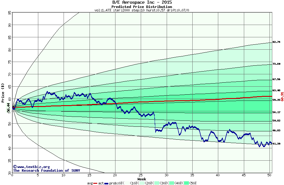 The following graph plots the year-to-date performance of the stock for 2015 compared to the probability calculated by a random walk model.