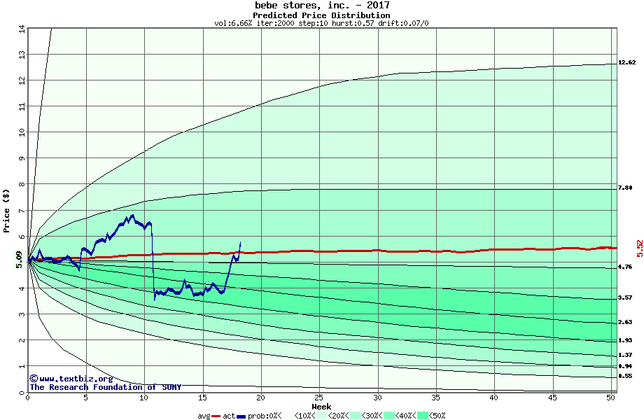The following graph plots the year-to-date performance of the stock for 2017 compared to the probability calculated by a random walk model.