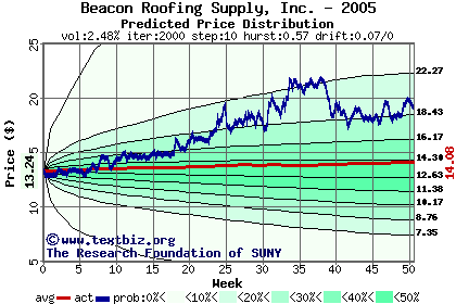 The following graph plots the year-to-date performance of the stock for 2005 compared to the probability calculated by a random walk model.