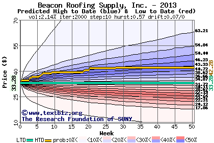 The high to date and low to date prices of the stock plotted against a random walk model for 2013 (what's this?).