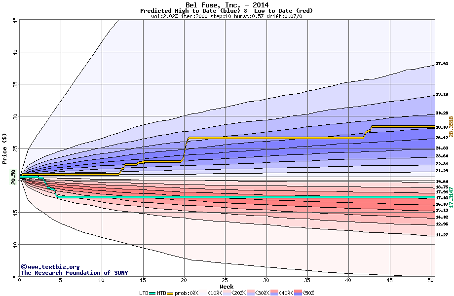 The high to date and low to date prices of the stock plotted against a random walk model for 2014 (what's this?).
