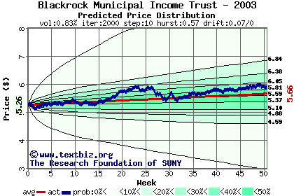 The high to date and low to date prices of the stock plotted against a random walk model for 2003 (what's this?).
