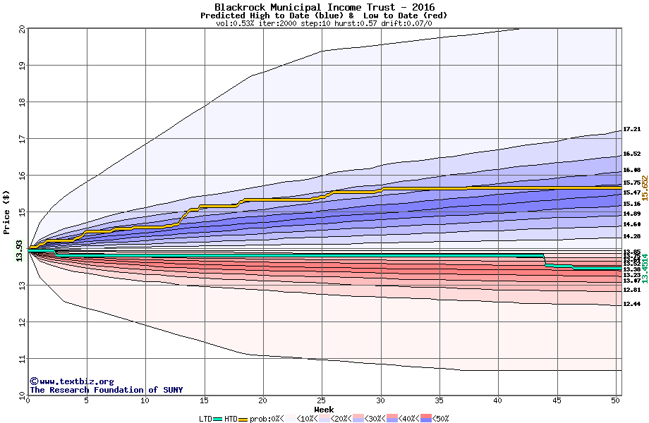 The high to date and low to date prices of the stock plotted against a random walk model for 2016 (what's this?).