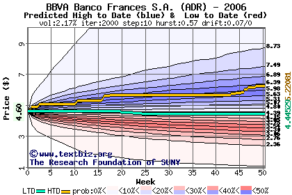 The high to date and low to date prices of the stock plotted against a random walk model for 2006 (what's this?).