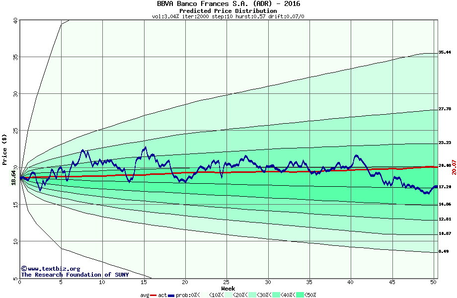 The high to date and low to date prices of the stock plotted against a random walk model for 2016 (what's this?).
