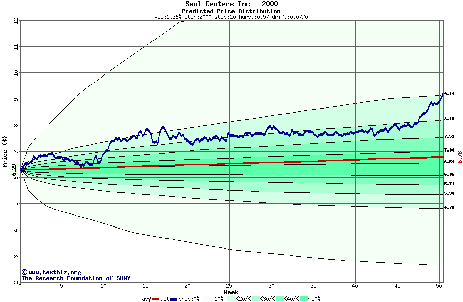The following graph plots the year-to-date performance of the stock for 2000 compared to the probability calculated by a random walk model.