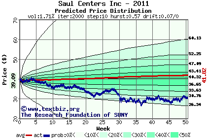 The high to date and low to date prices of the stock plotted against a random walk model for 2011 (what's this?).
