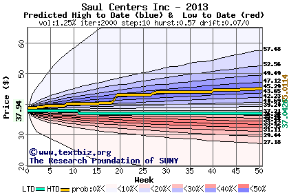 The high to date and low to date prices of the stock plotted against a random walk model for 2013 (what's this?).
