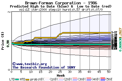 The high to date and low to date prices of the stock plotted against a random walk model for 1986 (what's this?).