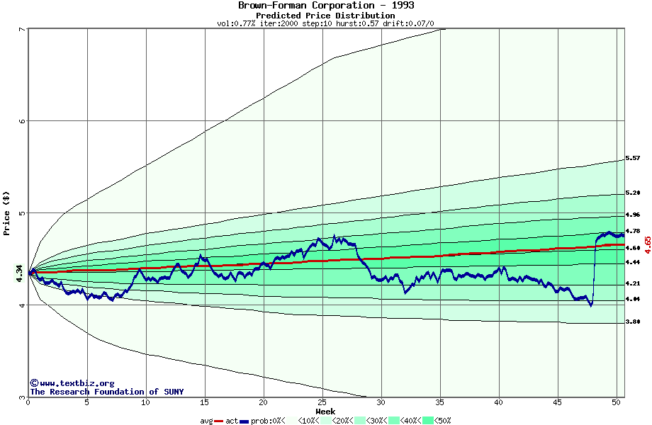 The following graph plots the year-to-date performance of the stock for 1993 compared to the probability calculated by a random walk model.