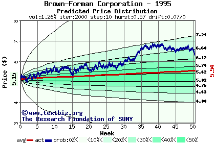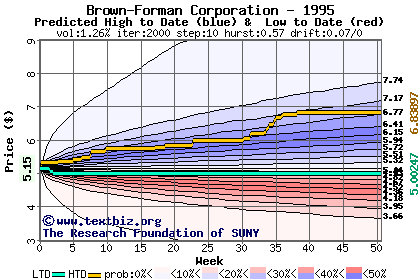 The high to date and low to date prices of the stock plotted against a random walk model for 1995 (what's this?).