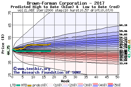 The high to date and low to date prices of the stock plotted against a random walk model for 2017 (what's this?).