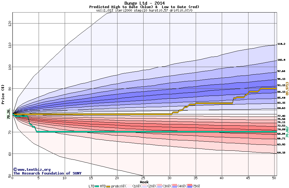 The high to date and low to date prices of the stock plotted against a random walk model for 2014 (what's this?).