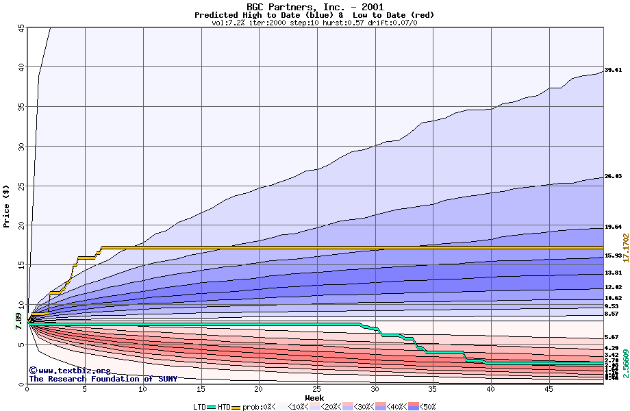 The high to date and low to date prices of the stock plotted against a random walk model for 2001 (what's this?).