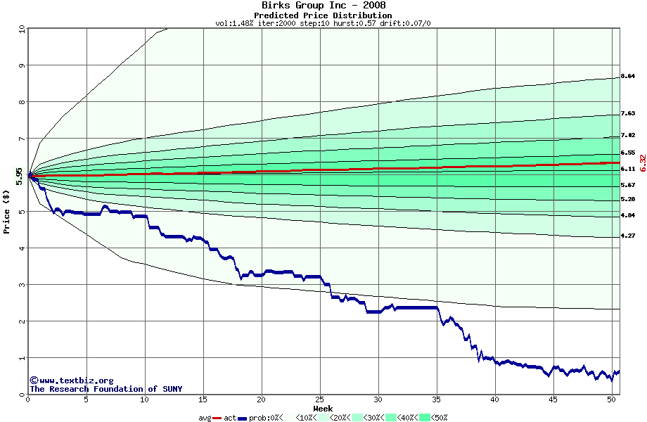 The following graph plots the year-to-date performance of the stock for 2008 compared to the probability calculated by a random walk model.