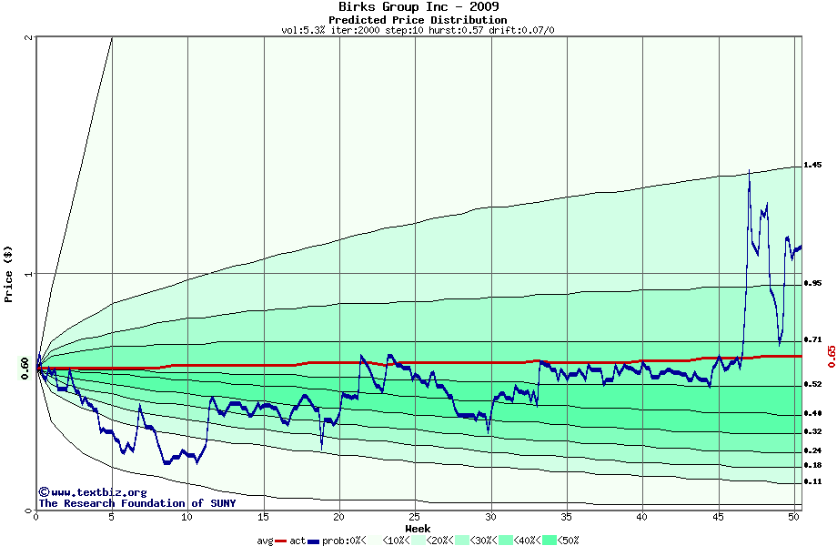 The following graph plots the year-to-date performance of the stock for 2009 compared to the probability calculated by a random walk model.