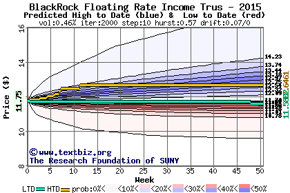 The high to date and low to date prices of the stock plotted against a random walk model for 2015 (what's this?).