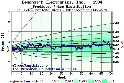 The high to date and low to date prices of the stock plotted against a random walk model for 1994 (what's this?).