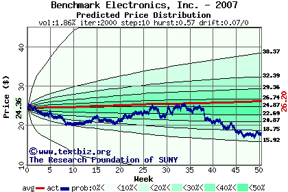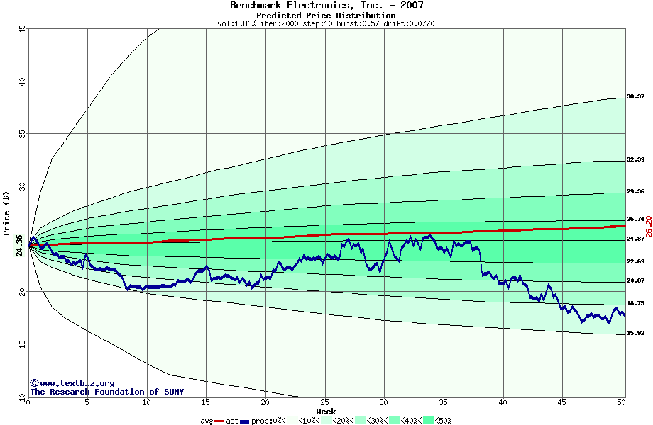 The following graph plots the year-to-date performance of the stock for 2007 compared to the probability calculated by a random walk model.