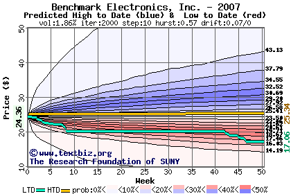 The high to date and low to date prices of the stock plotted against a random walk model for 2007 (what's this?).