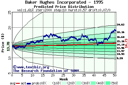 The high to date and low to date prices of the stock plotted against a random walk model for 1995 (what's this?).