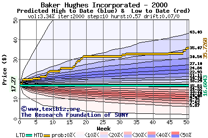 The high to date and low to date prices of the stock plotted against a random walk model for 2000 (what's this?).