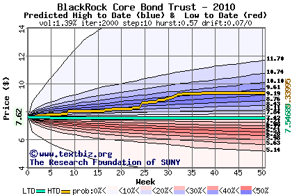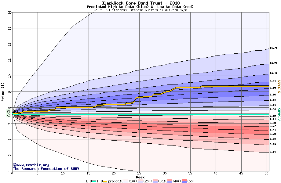 The high to date and low to date prices of the stock plotted against a random walk model for 2010 (what's this?).