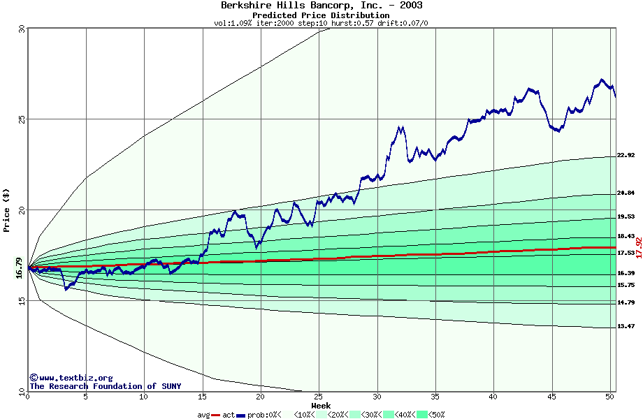 The following graph plots the year-to-date performance of the stock for 2003 compared to the probability calculated by a random walk model.