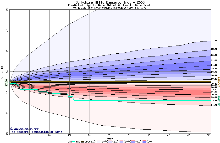 The high to date and low to date prices of the stock plotted against a random walk model for 2005 (what's this?).