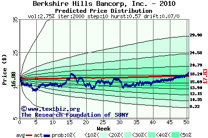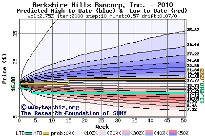 The high to date and low to date prices of the stock plotted against a random walk model for 2010 (what's this?).