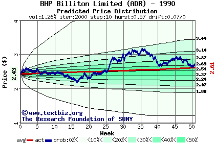 The high to date and low to date prices of the stock plotted against a random walk model for 1990 (what's this?).