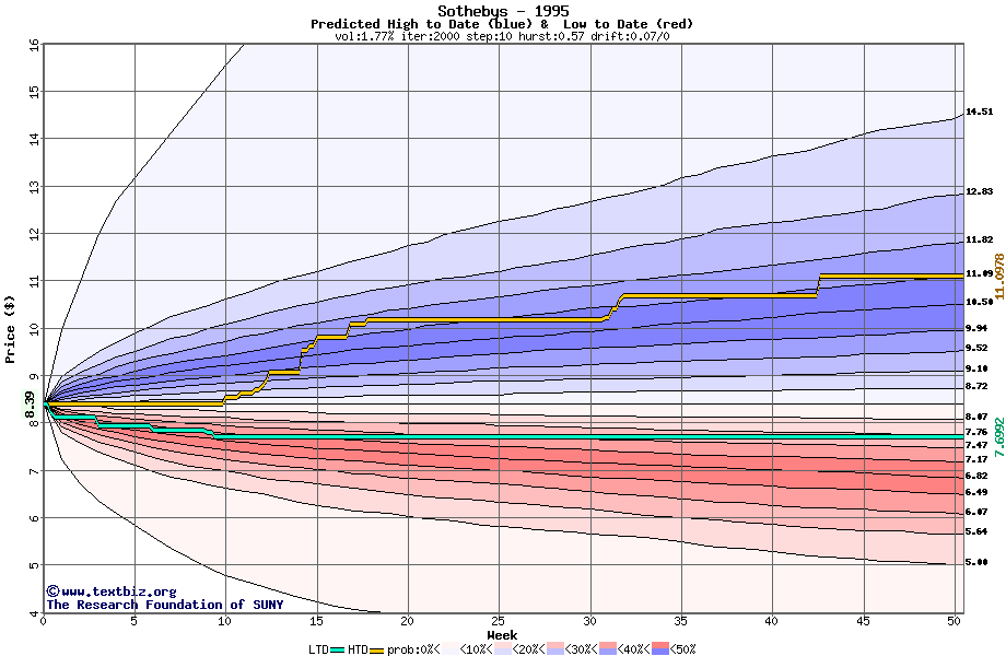 The high to date and low to date prices of the stock plotted against a random walk model for 1995 (what's this?).
