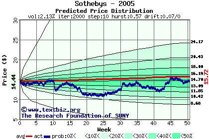 The high to date and low to date prices of the stock plotted against a random walk model for 2005 (what's this?).