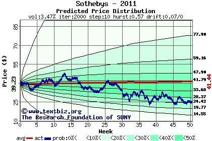 The high to date and low to date prices of the stock plotted against a random walk model for 2011 (what's this?).