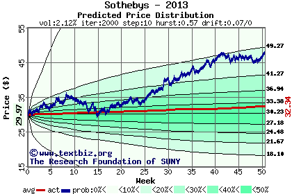 The high to date and low to date prices of the stock plotted against a random walk model for 2013 (what's this?).